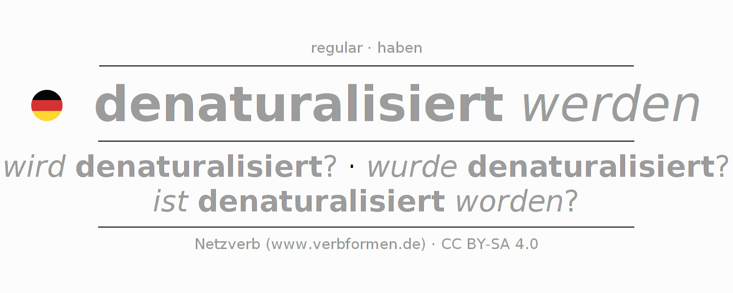 A conjugação do verbo denaturalisieren (desnaturalizar, desnaturalização) é regular. As formas mais comuns são wird denaturalisiert?, wurde denaturalisiert? e ist denaturalisiert worden?. O verbo auxilar para denaturalisieren é "haben".