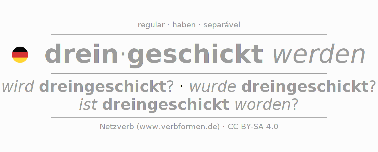 O prefixo drein - de dreinschicken é separável. A flexão ocorre em Voz Passiva e é usada como Oração interrogativa. Para melhor compreensão estão disponíveis incontáveis. Exemplos do verbo dreinschicken . Para a prática e consolidação do estudo