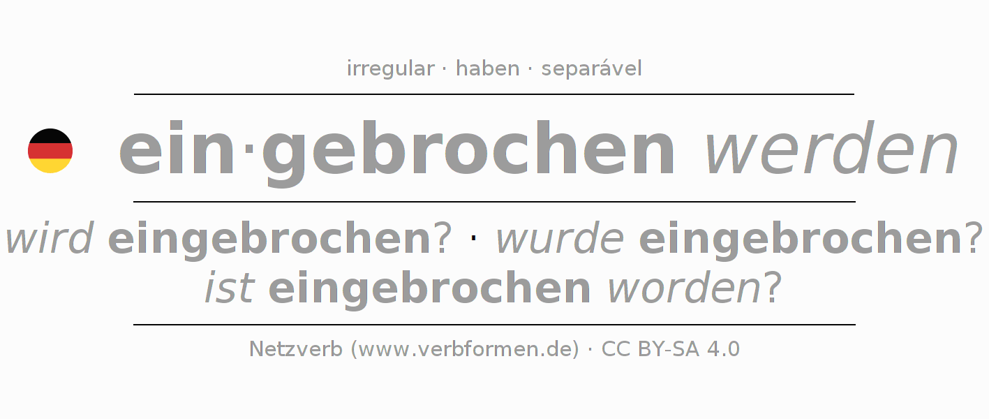 A conjugação do verbo einbrechen (assaltar, arrombamento) é irregular. As formas mais comuns são wird eingebrochen?, wurde eingebrochen? e ist eingebrochen worden?. A apofonia é feita com a vogal do radical e