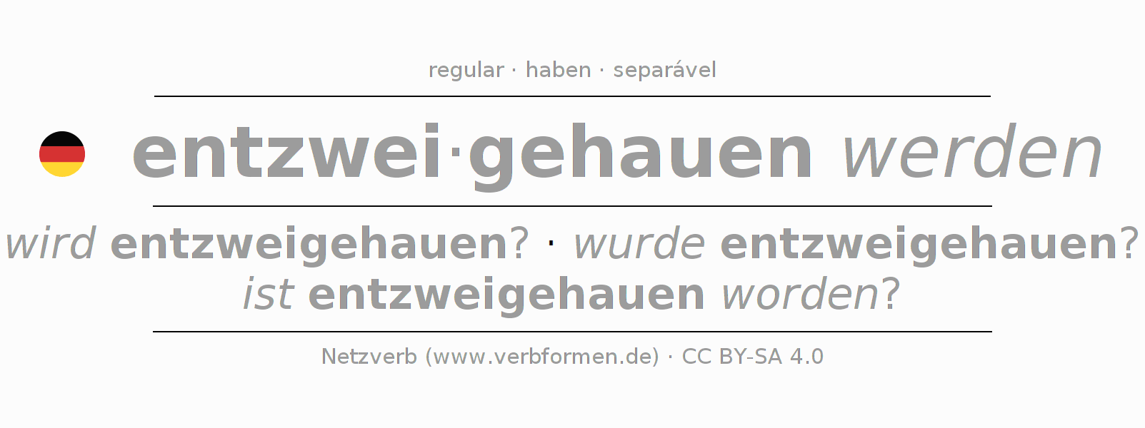 A conjugação do verbo entzweihauen (partir, quebrar) é regular. As formas mais comuns são wird entzweigehauen?, wurde entzweigehauen? e ist entzweigehauen worden?. O verbo auxilar para entzweihauen é "haben".