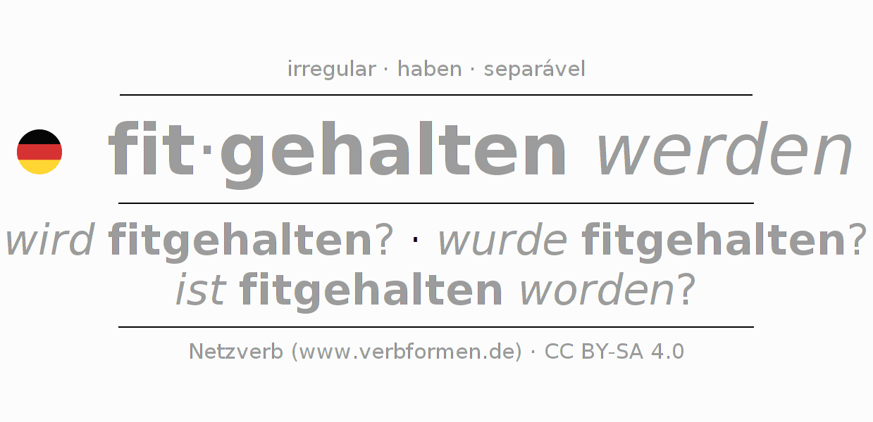 A conjugação do verbo fithalten (manter a forma, manter-se em forma) é irregular. As formas mais comuns são wird fitgehalten?, wurde fitgehalten? e ist fitgehalten worden?. A apofonia é feita com a vogal do radical a