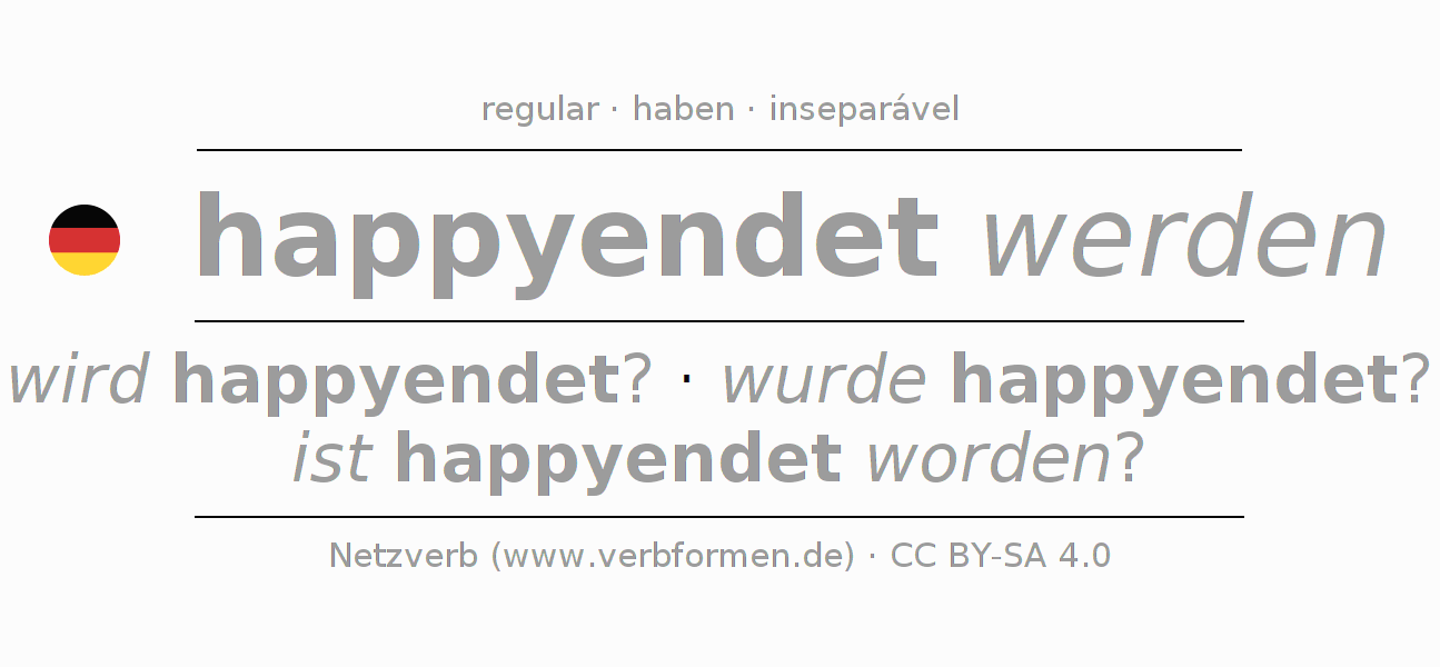 A conjugação do verbo happyenden (final feliz) é regular. As formas mais comuns são wird happyendet?, wurde happyendet? e ist happyendet worden?. O verbo auxilar para happyenden é "haben".