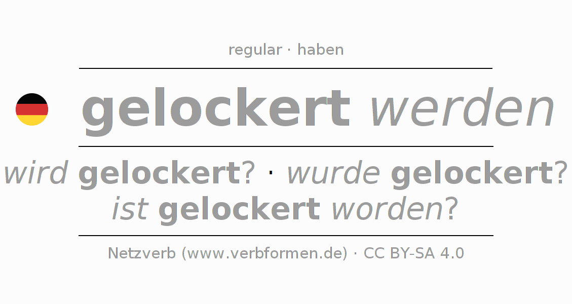 A conjugação do verbo lockern (afrouxar, relaxar) é regular. As formas mais comuns são wird gelockert?, wurde gelockert? e ist gelockert worden?. O verbo auxilar para lockern é "haben".