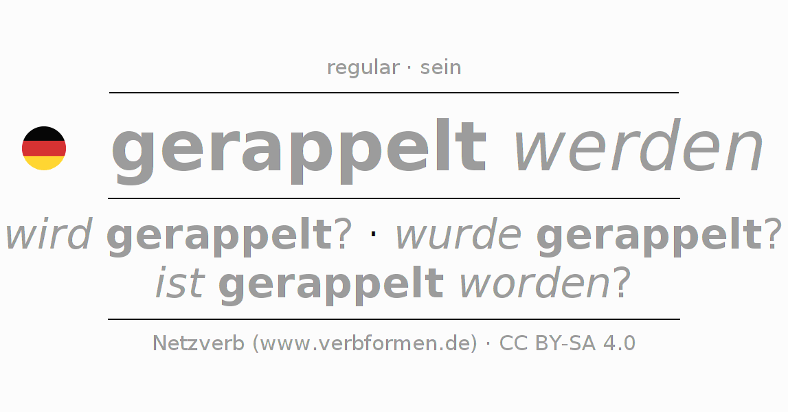 A conjugação do verbo rappeln (barulho, ranger) é regular. As formas mais comuns são wird gerappelt?, wurde gerappelt? e ist gerappelt worden?. O verbo auxilar para rappeln é "sein". No entanto, há formas verbais com o verbo auxiliar " haben".