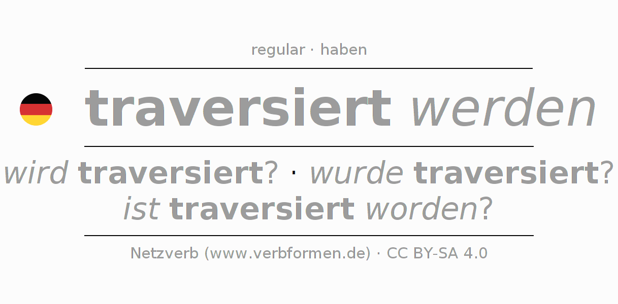 A conjugação do verbo traversieren (traversar, cavalgar diagonalmente) é regular. As formas mais comuns são wird traversiert?, wurde traversiert? e ist traversiert worden?. O verbo auxilar para traversieren é "haben". No entanto, há formas verbais com o verbo auxiliar " sein".