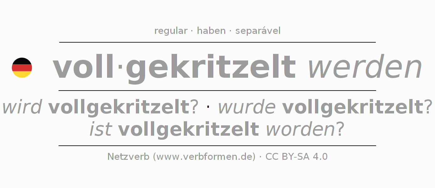 A conjugação do verbo vollkritzeln (cobrir de rabiscos, rabiscado) é regular. As formas mais comuns são wird vollgekritzelt?, wurde vollgekritzelt? e ist vollgekritzelt worden?. O verbo auxilar para vollkritzeln é "haben".