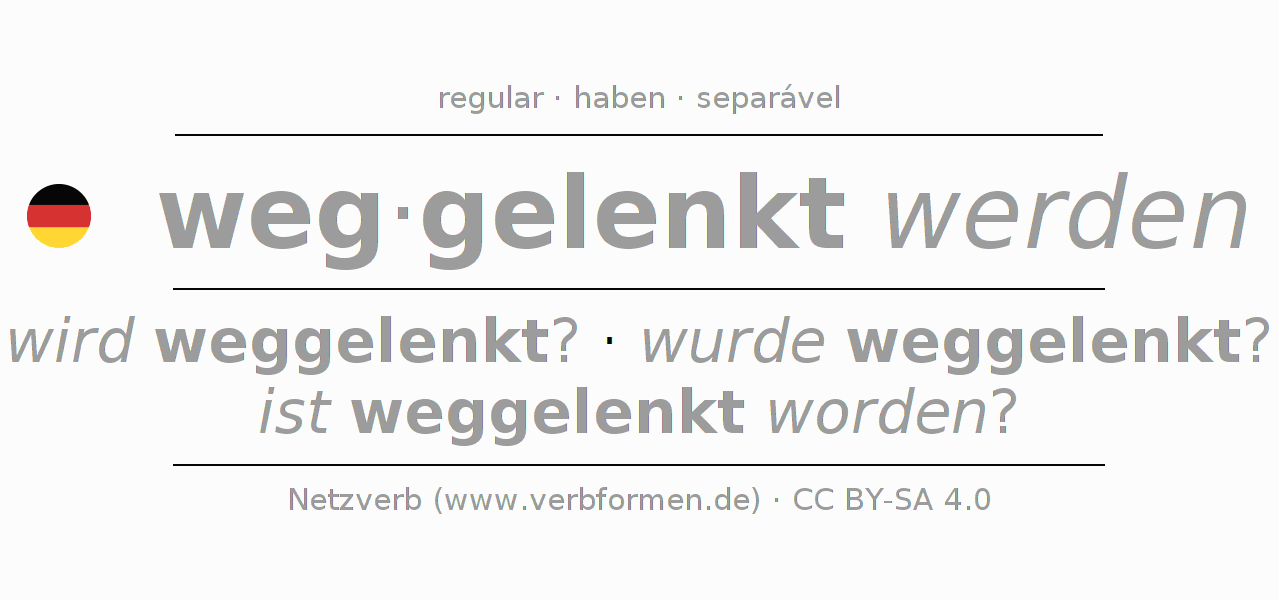 A conjugação do verbo weglenken (desviar, desvio) é regular. As formas mais comuns são wird weggelenkt?, wurde weggelenkt? e ist weggelenkt worden?. O verbo auxilar para weglenken é "haben".