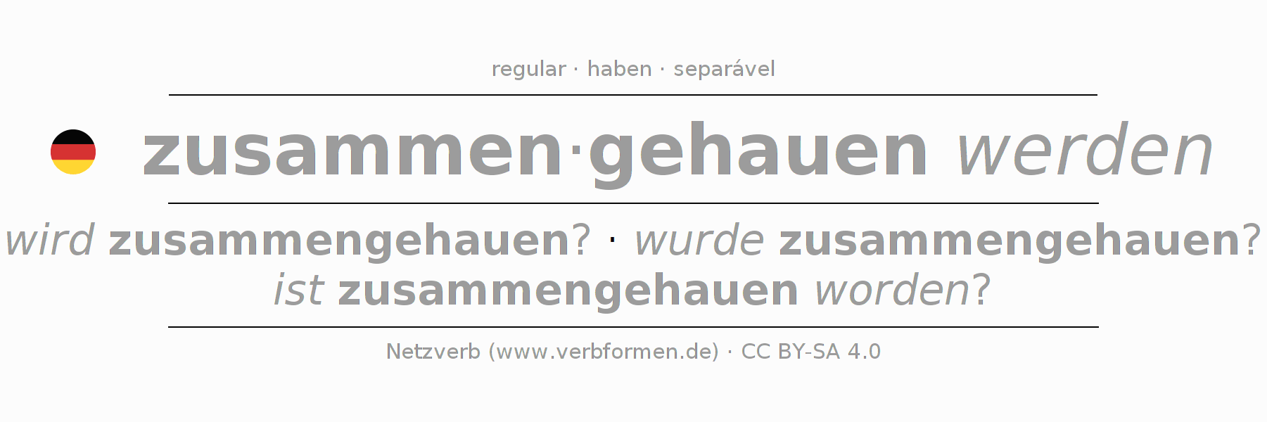 A conjugação do verbo zusammenhauen (agredir, bater) é regular. As formas mais comuns são wird zusammengehauen?, wurde zusammengehauen? e ist zusammengehauen worden?. O verbo auxilar para zusammenhauen é "haben".