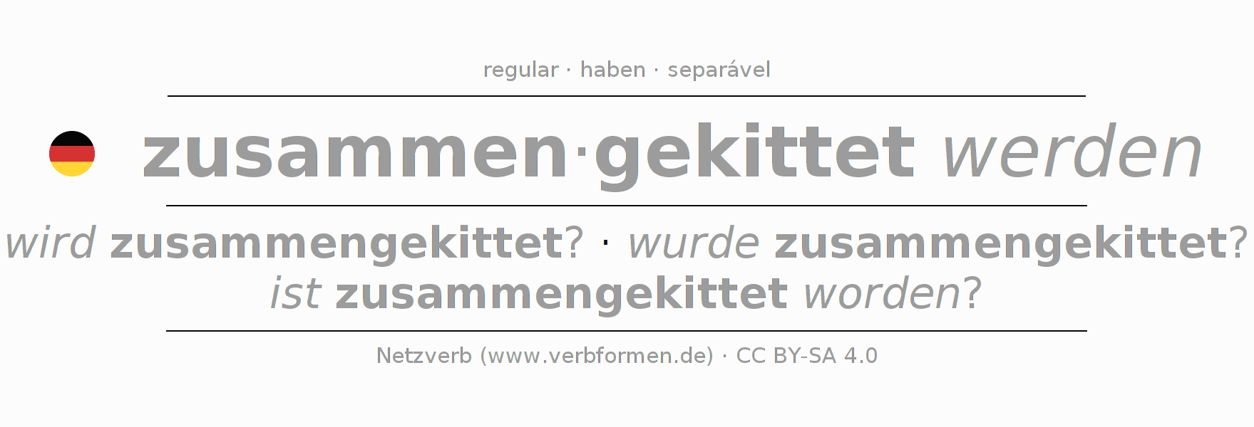 A conjugação do verbo zusammenkitten (unir, conectar) é regular. As formas mais comuns são wird zusammengekittet?, wurde zusammengekittet? e ist zusammengekittet worden?. O verbo auxilar para zusammenkitten é "haben".