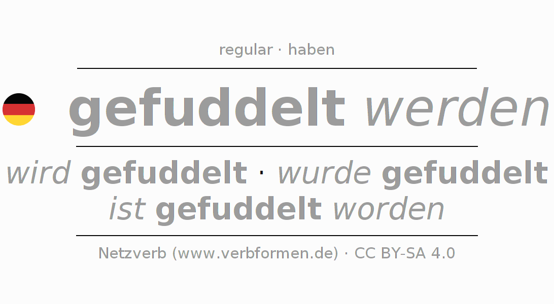 A conjugação do verbo fuddeln (trapacear, enganar) é regular. As formas mais comuns são wird gefuddelt, wurde gefuddelt e ist gefuddelt worden. O verbo auxilar para fuddeln é "haben".