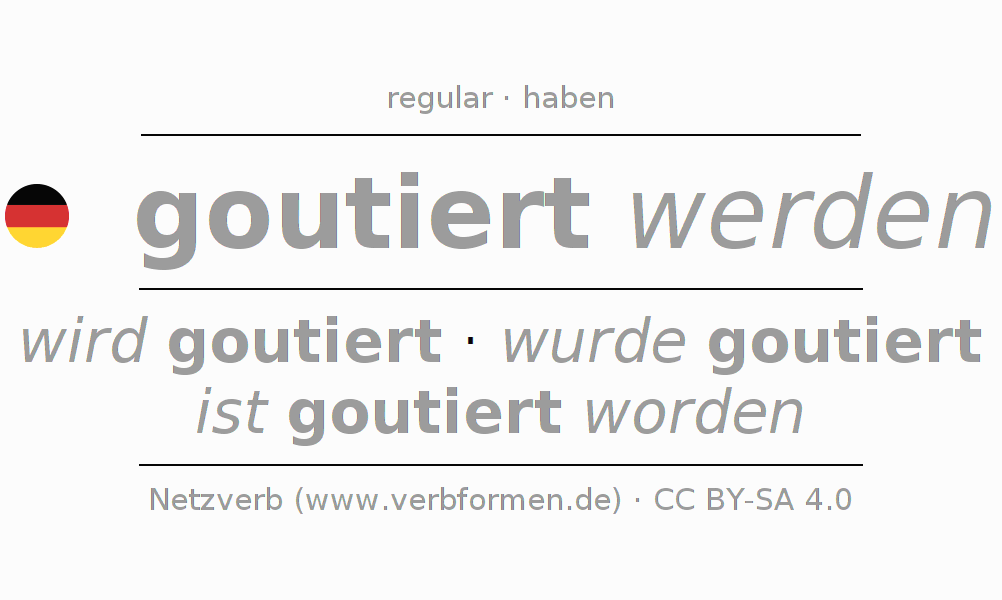 - Futuro I: ich werde goutiert werden, du wirst goutiert werden, er wird goutiert werden, wir werden goutiert werden, ihr werdet goutiert werden, sie werden goutiert werden
