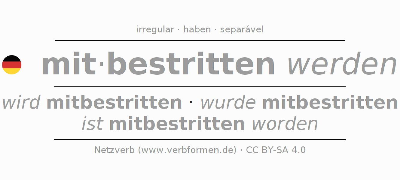 A conjugação do verbo mitbestreiten (cofinanciar) é irregular. As formas mais comuns são wird mitbestritten, wurde mitbestritten e ist mitbestritten worden. A apofonia é feita com a vogal do radical ei