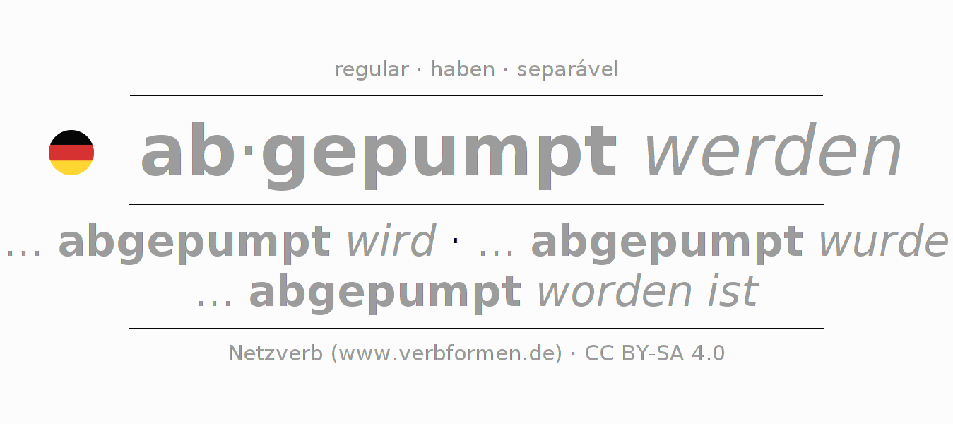 A conjugação do verbo abpumpen (bombear, emprestar) é regular. As formas mais comuns são ... abgepumpt wird, ... abgepumpt wurde e ... abgepumpt worden ist. O verbo auxilar para abpumpen é "haben".