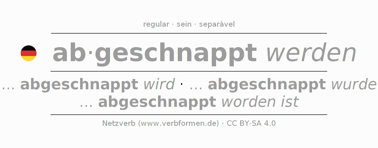 O prefixo ab - de abschnappen é separável. A flexão ocorre em Voz Passiva e é usada como Oração subordinada. Para melhor compreensão estão disponíveis incontáveis. Exemplos do verbo abschnappen . Para a prática e consolidação do estudo