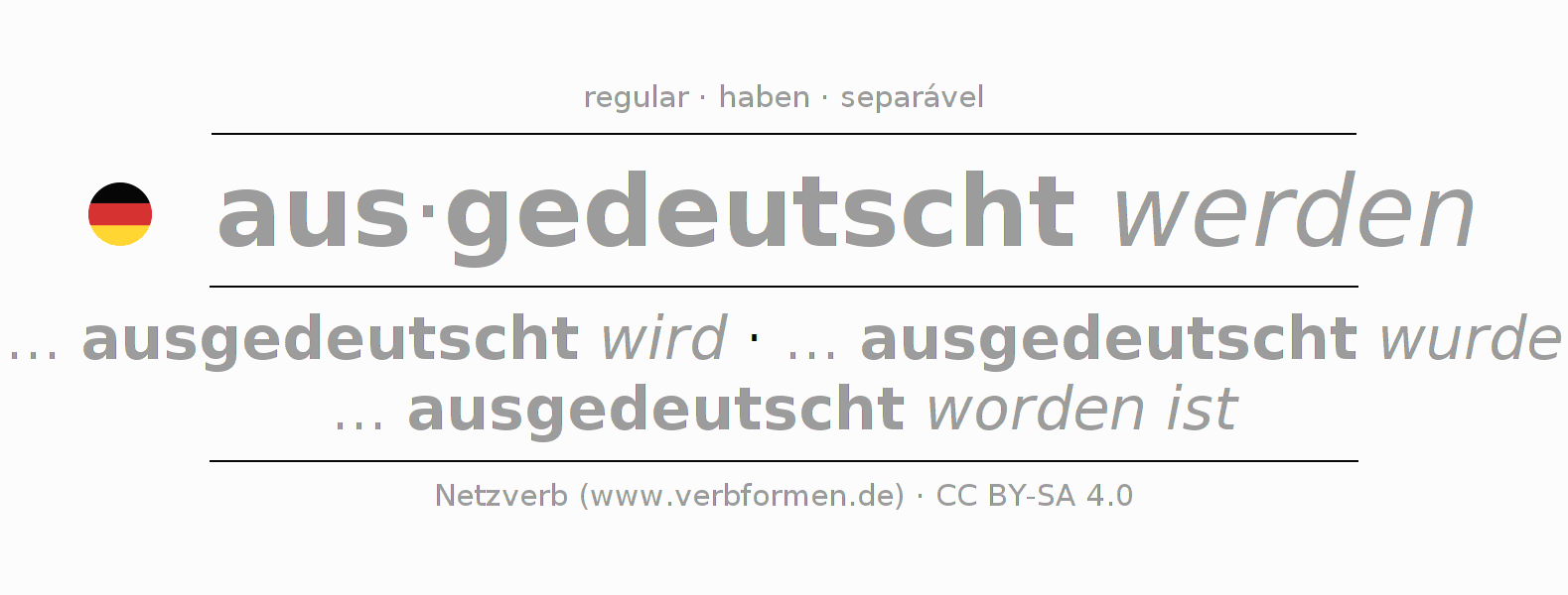 A conjugação do verbo aus·gedeutscht werden é apresentada online assim como a Tabela de Verbo com todas as formas verbais no singular e no plural, e em todas as pessoas (1ª pessoa, 2ª pessoa, 3ª pessoa) A flexão do verbo aus·gedeutscht werden é portanto, uma ajuda para os trabalhos de casa, testes, exames, aulas de alemão, para o estudo do alemão como língua estrangeira, como segunda língua e também na formação de adultos. Especialmente no aprendizado do alemão é importante a conjugação correta do verbo com as respectivamente formas flexionadas corretamente (... ausgedeutscht wird - ... ausgedeutscht wurde - ... ausgedeutscht worden ist). Mais informações podem ser encontradas no Wiktionary ausdeutschen e no Duden ausdeutschen.