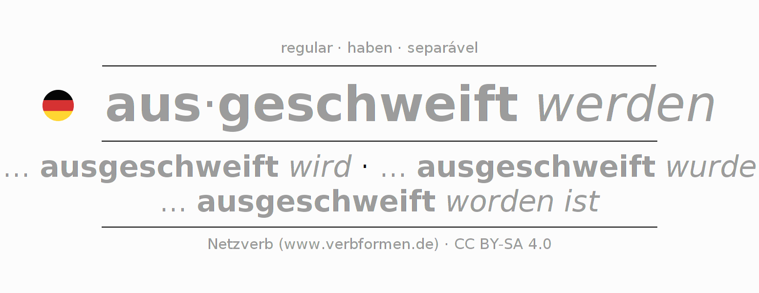 A conjugação do verbo ausschweifen (cercear, contornar) é regular. As formas mais comuns são ... ausgeschweift wird, ... ausgeschweift wurde e ... ausgeschweift worden ist. O verbo auxilar para ausschweifen é "haben". No entanto, há formas verbais com o verbo auxiliar " sein".