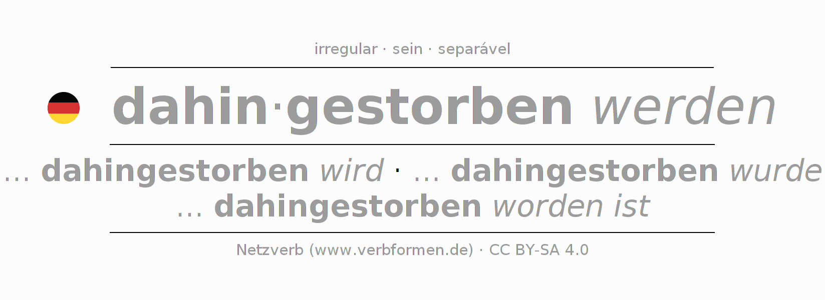 A conjugação do verbo dahinsterben (morrer, desaparecer) é irregular. As formas mais comuns são ... dahingestorben wird, ... dahingestorben wurde e ... dahingestorben worden ist. A apofonia é feita com a vogal do radical e