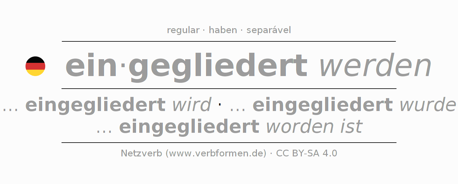 A conjugação do verbo eingliedern (incorporar, integrar) é regular. As formas mais comuns são ... eingegliedert wird, ... eingegliedert wurde e ... eingegliedert worden ist. O verbo auxilar para eingliedern é "haben".