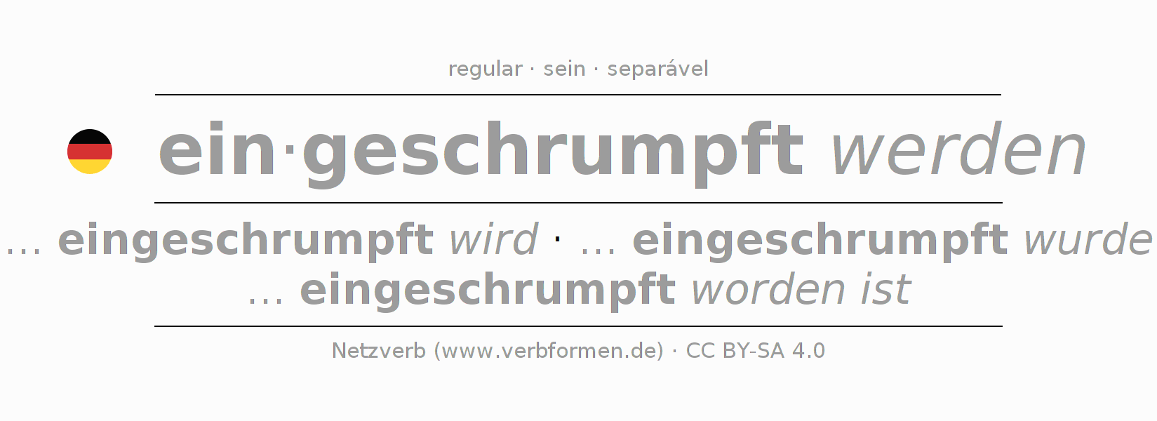 A conjugação do verbo ein·geschrumpft werden é apresentada online assim como a Tabela de Verbo com todas as formas verbais no singular e no plural, e em todas as pessoas (1ª pessoa, 2ª pessoa, 3ª pessoa) A flexão do verbo ein·geschrumpft werden é portanto, uma ajuda para os trabalhos de casa, testes, exames, aulas de alemão, para o estudo do alemão como língua estrangeira, como segunda língua e também na formação de adultos. Especialmente no aprendizado do alemão é importante a conjugação correta do verbo com as respectivamente formas flexionadas corretamente (... eingeschrumpft wird - ... eingeschrumpft wurde - ... eingeschrumpft worden ist). Mais informações podem ser encontradas no Wiktionary einschrumpfen e no Duden einschrumpfen.
