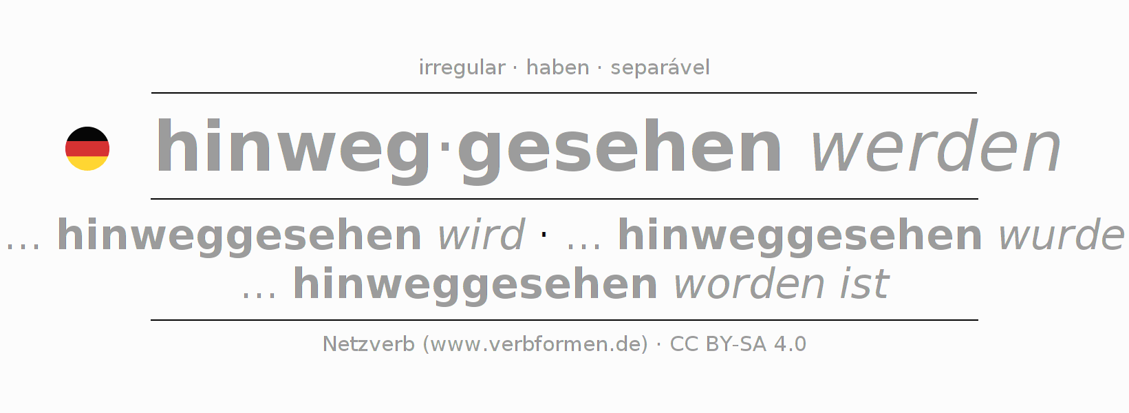 A conjugação do verbo hinwegsehen (desconsiderar, descontar) é irregular. As formas mais comuns são ... hinweggesehen wird, ... hinweggesehen wurde e ... hinweggesehen worden ist. A apofonia é feita com a vogal do radical e