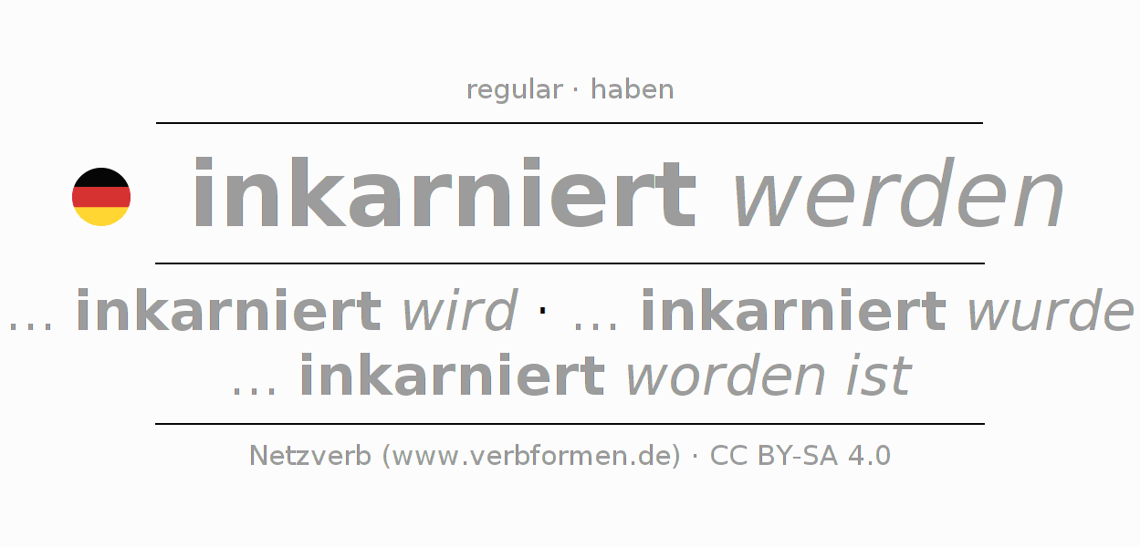 - Futuro I: ... ich inkarniert werden werde, ... du inkarniert werden wirst, ... er inkarniert werden wird, ... wir inkarniert werden werden, ... ihr inkarniert werden werdet, ... sie inkarniert werden werden