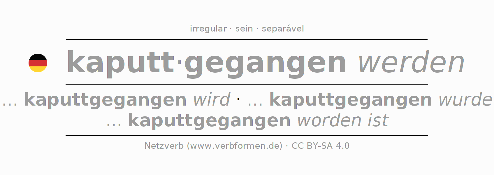 A conjugação do verbo kaputtgehen (quebrar, estragar) é irregular. As formas mais comuns são ... kaputtgegangen wird, ... kaputtgegangen wurde e ... kaputtgegangen worden ist. A apofonia é feita com a vogal do radical e