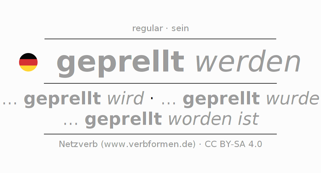 A conjugação do verbo geprellt werden é apresentada online assim como a Tabela de Verbo com todas as formas verbais no singular e no plural, e em todas as pessoas (1ª pessoa, 2ª pessoa, 3ª pessoa) A flexão do verbo geprellt werden é portanto, uma ajuda para os trabalhos de casa, testes, exames, aulas de alemão, para o estudo do alemão como língua estrangeira, como segunda língua e também na formação de adultos. Especialmente no aprendizado do alemão é importante a conjugação correta do verbo com as respectivamente formas flexionadas corretamente (... geprellt wird - ... geprellt wurde - ... geprellt worden ist). Mais informações podem ser encontradas no Wiktionary prellen e no Duden prellen.