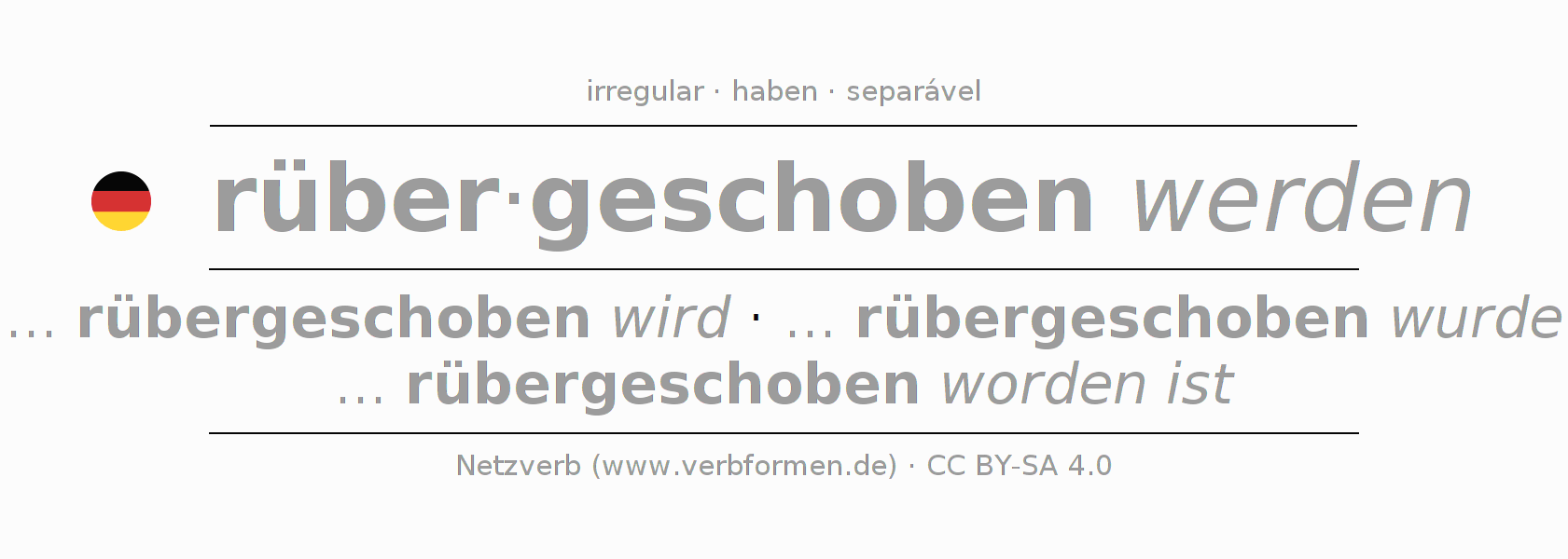 A conjugação do verbo rüberschieben (deslocar, empurrar para o lado) é irregular. As formas mais comuns são ... rübergeschoben wird, ... rübergeschoben wurde e ... rübergeschoben worden ist. A apofonia é feita com a vogal do radical ie