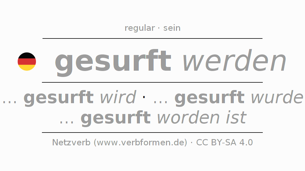 - Pretérito: ... ich gesurft werden würde, ... du gesurft werden würdest, ... er gesurft werden würde, ... wir gesurft werden würden, ... ihr gesurft werden würdet, ... sie gesurft werden würden