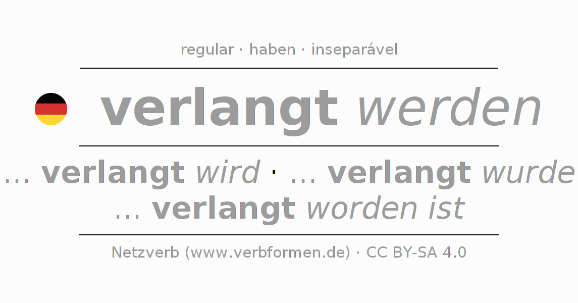 A conjugação do verbo verlangen (exigir, demandar) é regular. As formas mais comuns são ... verlangt wird, ... verlangt wurde e ... verlangt worden ist. O verbo auxilar para verlangen é "haben".