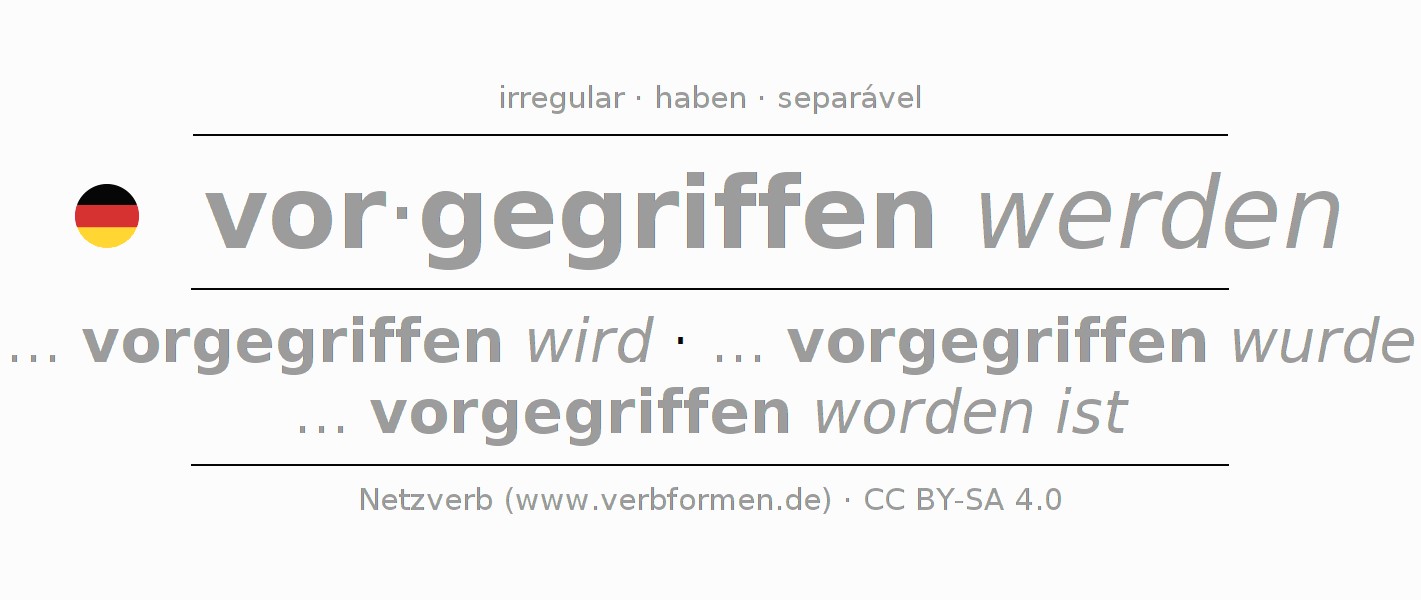 A conjugação do verbo vorgreifen (antecipar, prevenir) é irregular. As formas mais comuns são ... vorgegriffen wird, ... vorgegriffen wurde e ... vorgegriffen worden ist. A apofonia é feita com a vogal do radical ei