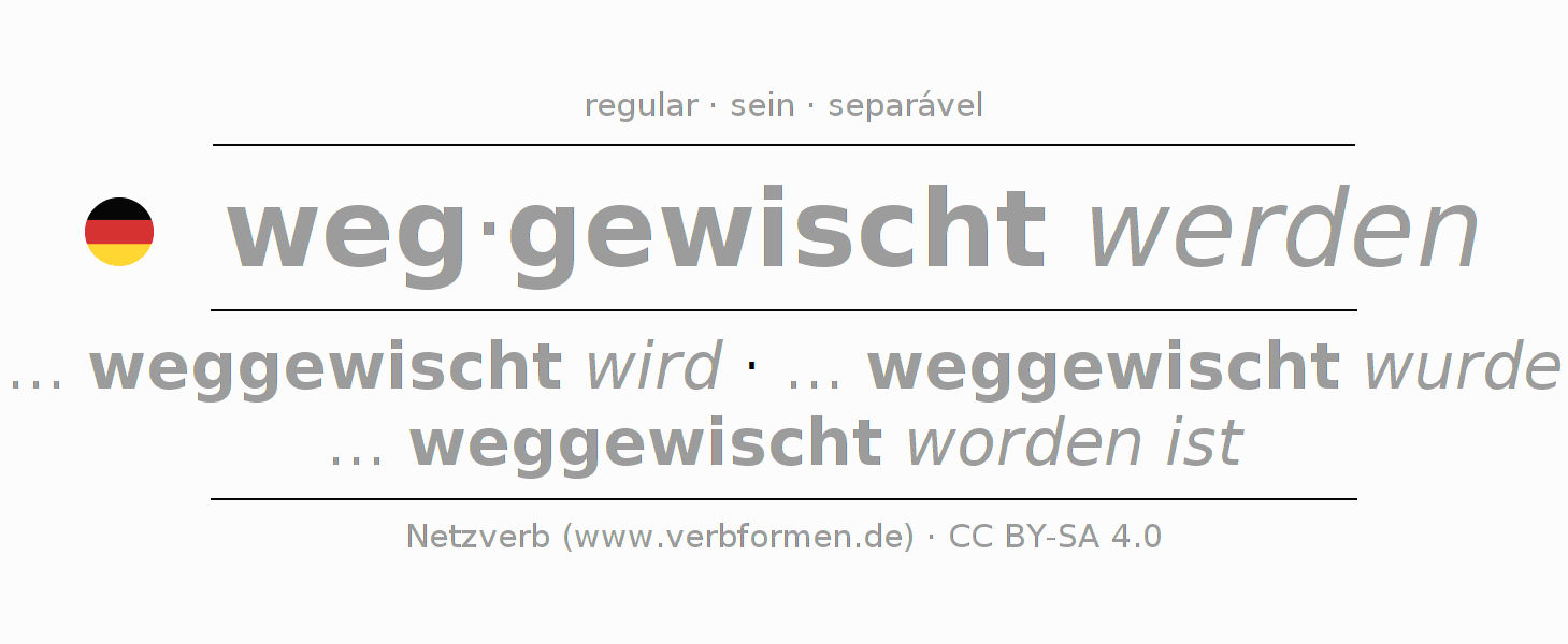A conjugação do verbo weg·gewischt werden é apresentada online assim como a Tabela de Verbo com todas as formas verbais no singular e no plural, e em todas as pessoas (1ª pessoa, 2ª pessoa, 3ª pessoa) A flexão do verbo weg·gewischt werden é portanto, uma ajuda para os trabalhos de casa, testes, exames, aulas de alemão, para o estudo do alemão como língua estrangeira, como segunda língua e também na formação de adultos. Especialmente no aprendizado do alemão é importante a conjugação correta do verbo com as respectivamente formas flexionadas corretamente (... weggewischt wird - ... weggewischt wurde - ... weggewischt worden ist). Mais informações podem ser encontradas no Wiktionary wegwischen e no Duden wegwischen.