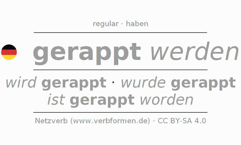 A conjugação do verbo rappen (rap) é regular. As formas mais comuns são wird gerappt, wurde gerappt e ist gerappt worden. O verbo auxilar para rappen é "haben".