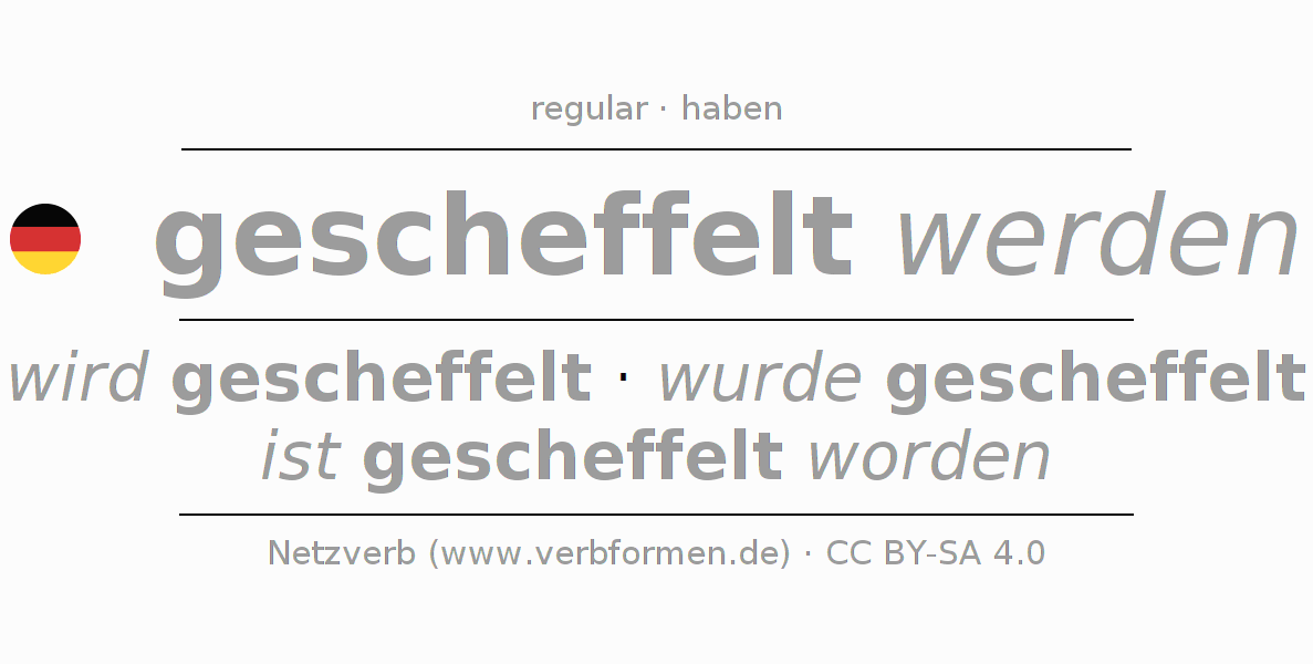 A conjugação do verbo gescheffelt werden é apresentada online assim como a Tabela de Verbo com todas as formas verbais no singular e no plural, e em todas as pessoas (1ª pessoa, 2ª pessoa, 3ª pessoa) A flexão do verbo gescheffelt werden é portanto, uma ajuda para os trabalhos de casa, testes, exames, aulas de alemão, para o estudo do alemão como língua estrangeira, como segunda língua e também na formação de adultos. Especialmente no aprendizado do alemão é importante a conjugação correta do verbo com as respectivamente formas flexionadas corretamente (wird gescheffelt - wurde gescheffelt - ist gescheffelt worden). Mais informações podem ser encontradas no Wiktionary scheffeln e no Duden scheffeln.