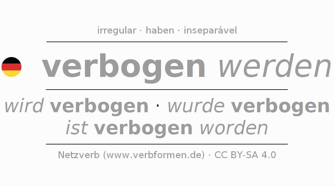 A conjugação do verbo verbiegen (dobrar, distorcer) é irregular. As formas mais comuns são wird verbogen, wurde verbogen e ist verbogen worden. A apofonia é feita com a vogal do radical ie
