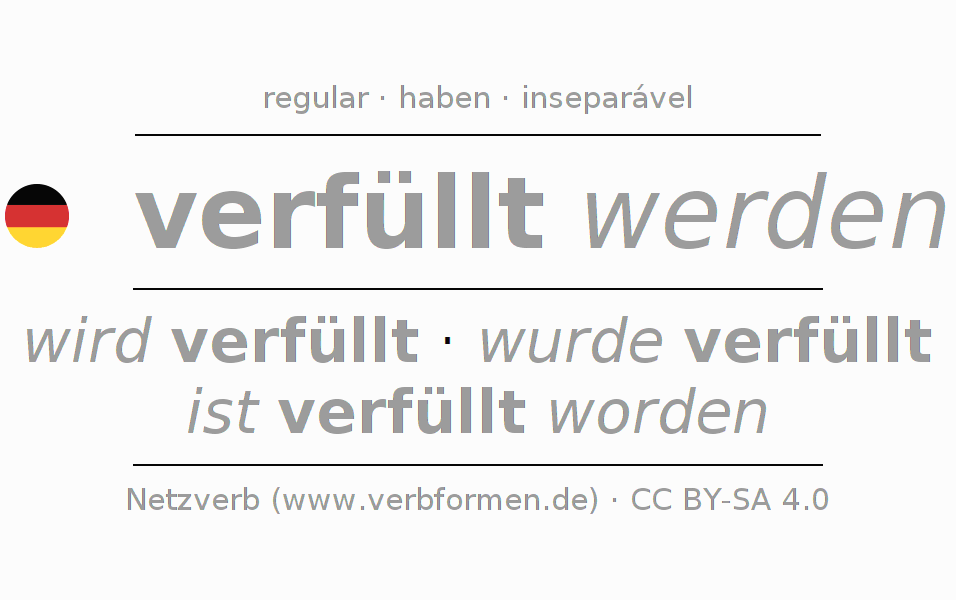 A conjugação do verbo verfüllen (preencher, carregar) é regular. As formas mais comuns são wird verfüllt, wurde verfüllt e ist verfüllt worden. O verbo auxilar para verfüllen é "haben".
