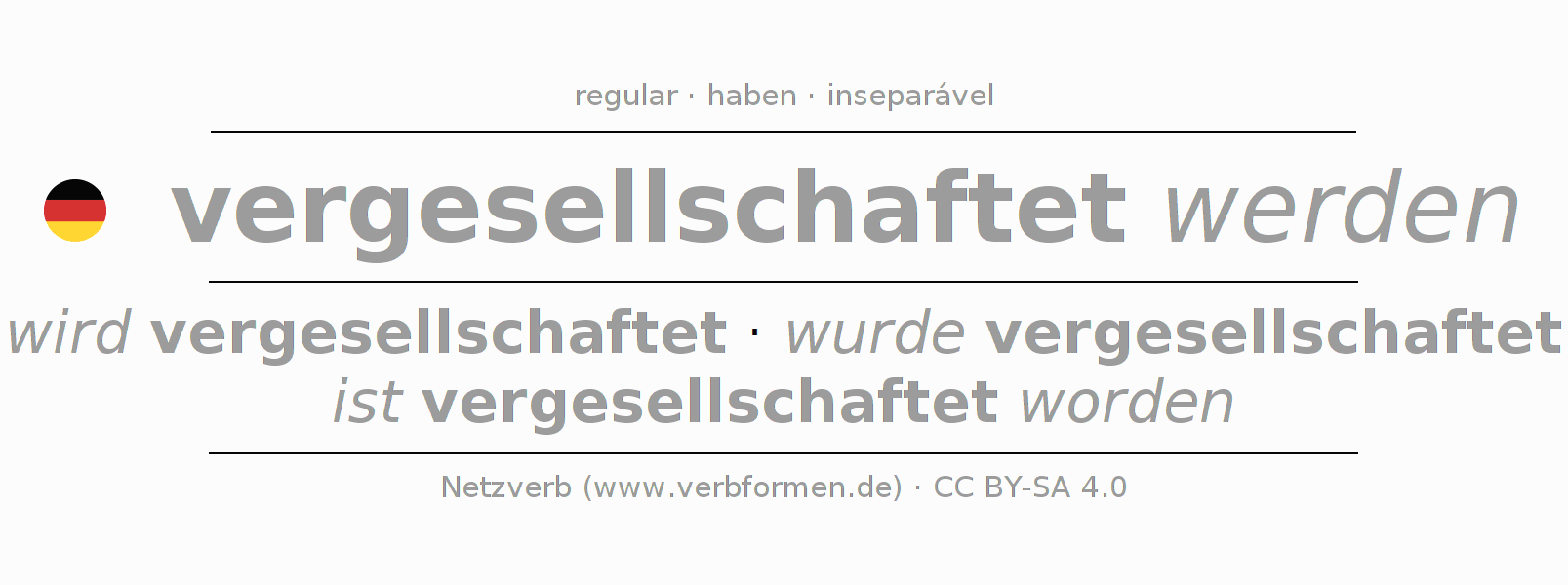 O prefixo ver- de vergesellschaften é inseparável. A flexão ocorre em Voz Passiva e é usada como Oração principal. Para melhor compreensão estão disponíveis incontáveis. Exemplos do verbo vergesellschaften . Para a prática e consolidação do estudo