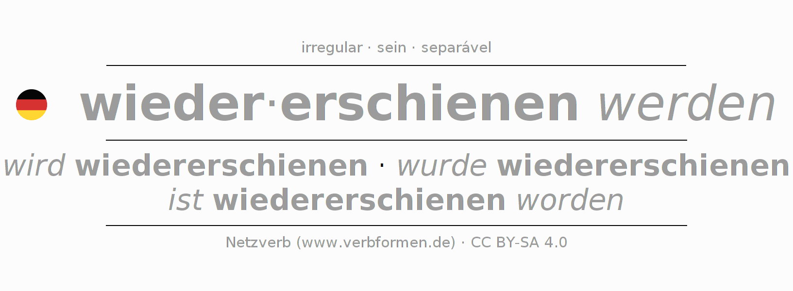 A conjugação do verbo wiedererscheinen (reaparecer, voltar a aparecer) é irregular. As formas mais comuns são wird wiedererschienen, wurde wiedererschienen e ist wiedererschienen worden. A apofonia é feita com a vogal do radical ei