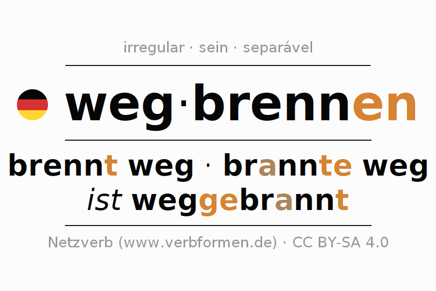 A conjugação do verbo weg·brennen é apresentada online assim como a Tabela de Verbo com todas as formas verbais no singular e no plural, e em todas as pessoas (1ª pessoa, 2ª pessoa, 3ª pessoa) A flexão do verbo weg·brennen é portanto, uma ajuda para os trabalhos de casa, testes, exames, aulas de alemão, para o estudo do alemão como língua estrangeira, como segunda língua e também na formação de adultos. Especialmente no aprendizado do alemão é importante a conjugação correta do verbo com as respectivamente formas flexionadas corretamente (brennt weg - brannte weg - ist weggebrannt). Mais informações podem ser encontradas no Wiktionary wegbrennen e no Duden wegbrennen.