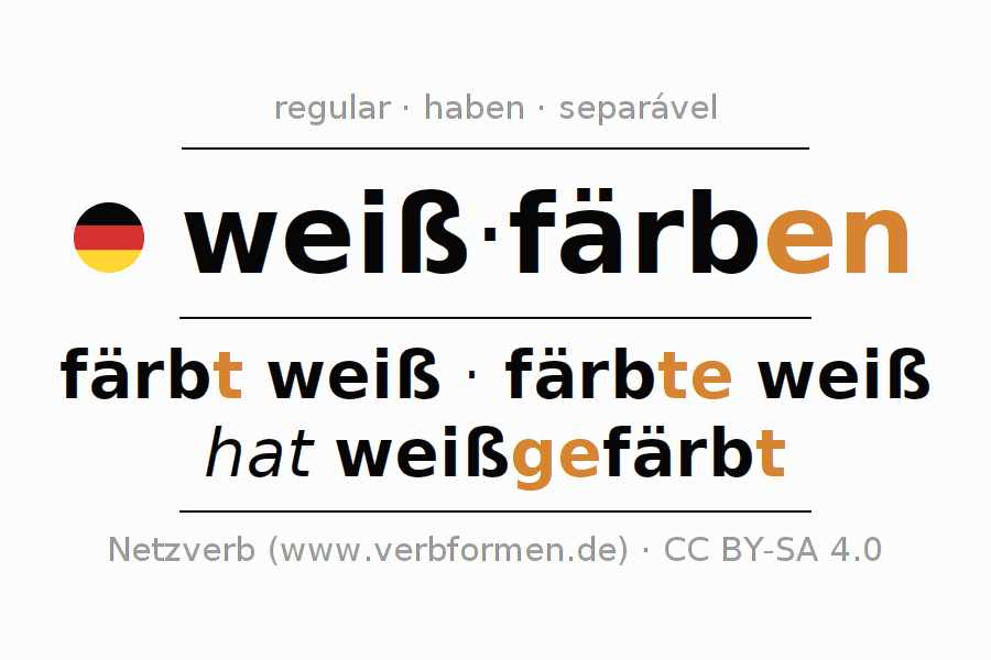 A conjugação do verbo weißfärben (branquear) é regular. As formas mais comuns são färbt weiß, färbte weiß e hat weißgefärbt. O verbo auxilar para weißfärben é "haben".