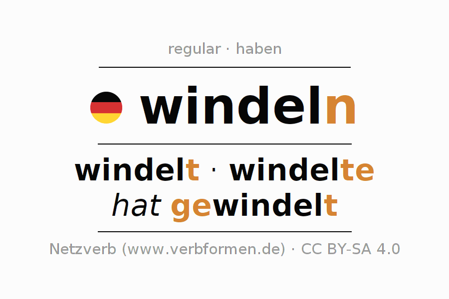 A conjugação do verbo windeln é apresentada online assim como a Tabela de Verbo com todas as formas verbais no singular e no plural, e em todas as pessoas (1ª pessoa, 2ª pessoa, 3ª pessoa) A flexão do verbo windeln é portanto, uma ajuda para os trabalhos de casa, testes, exames, aulas de alemão, para o estudo do alemão como língua estrangeira, como segunda língua e também na formação de adultos. Especialmente no aprendizado do alemão é importante a conjugação correta do verbo com as respectivamente formas flexionadas corretamente (windelt - windelte - hat gewindelt). Mais informações podem ser encontradas no Wiktionary windeln e no Duden windeln.