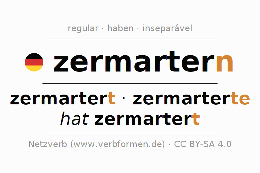 - Mais-que-perfeito: ich hatte zermartert, du hattest zermartert, er hatte zermartert, wir hatten zermartert, ihr hattet zermartert, sie hatten zermartert