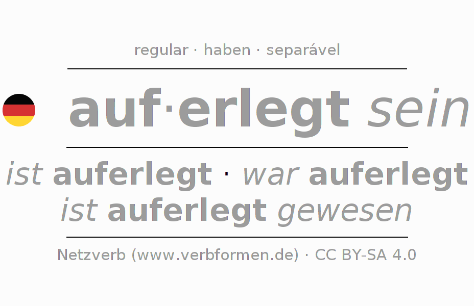 A conjugação do verbo auf·erlegt sein é apresentada online assim como a Tabela de Verbo com todas as formas verbais no singular e no plural, e em todas as pessoas (1ª pessoa, 2ª pessoa, 3ª pessoa) A flexão do verbo auf·erlegt sein é portanto, uma ajuda para os trabalhos de casa, testes, exames, aulas de alemão, para o estudo do alemão como língua estrangeira, como segunda língua e também na formação de adultos. Especialmente no aprendizado do alemão é importante a conjugação correta do verbo com as respectivamente formas flexionadas corretamente (ist auferlegt - war auferlegt - ist auferlegt gewesen). Mais informações podem ser encontradas no Wiktionary auferlegen e no Duden auferlegen.
