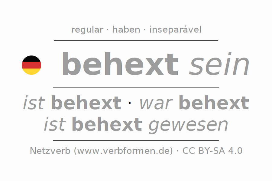 A conjugação do verbo behext sein é apresentada online assim como a Tabela de Verbo com todas as formas verbais no singular e no plural, e em todas as pessoas (1ª pessoa, 2ª pessoa, 3ª pessoa) A flexão do verbo behext sein é portanto, uma ajuda para os trabalhos de casa, testes, exames, aulas de alemão, para o estudo do alemão como língua estrangeira, como segunda língua e também na formação de adultos. Especialmente no aprendizado do alemão é importante a conjugação correta do verbo com as respectivamente formas flexionadas corretamente (ist behext - war behext - ist behext gewesen). Mais informações podem ser encontradas no Wiktionary behexen e no Duden behexen.
