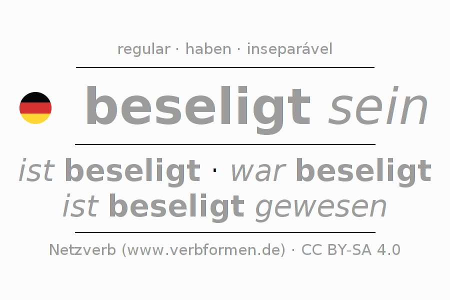 O prefixo be- de beseligen é inseparável. A flexão ocorre em Estado passivo e é usada como Oração principal. Para melhor compreensão estão disponíveis incontáveis. Exemplos do verbo beseligen . Para a prática e consolidação do estudo