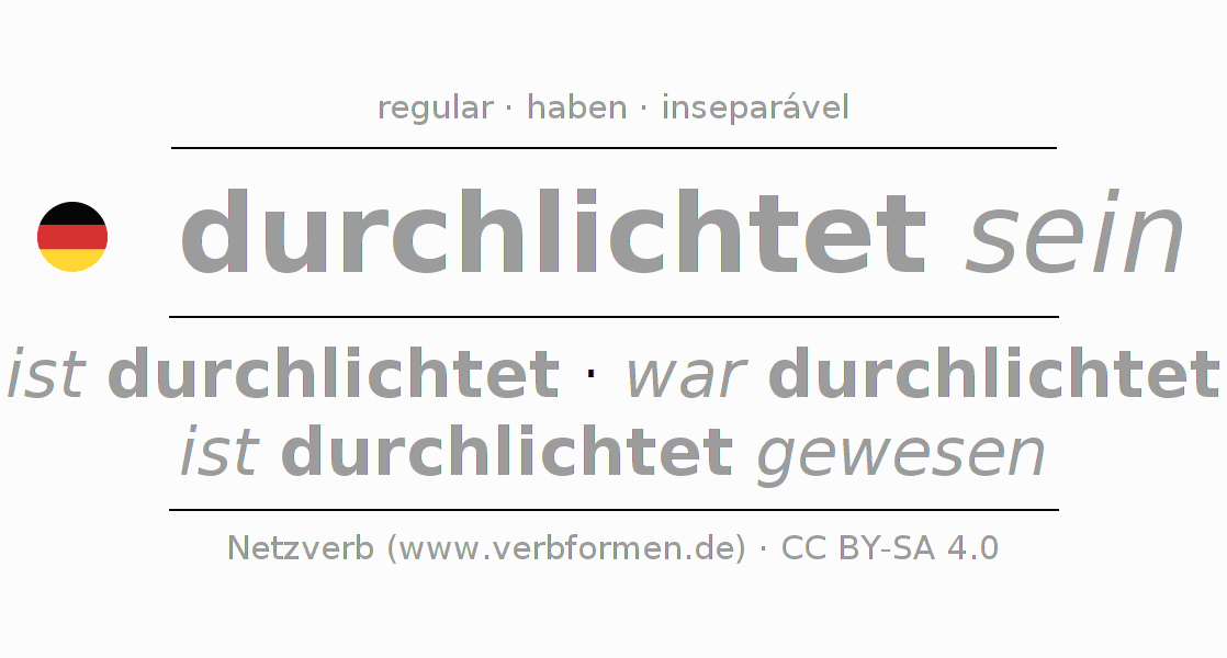 A conjugação do verbo durchlichtet sein é apresentada online assim como a Tabela de Verbo com todas as formas verbais no singular e no plural, e em todas as pessoas (1ª pessoa, 2ª pessoa, 3ª pessoa) A flexão do verbo durchlichtet sein é portanto, uma ajuda para os trabalhos de casa, testes, exames, aulas de alemão, para o estudo do alemão como língua estrangeira, como segunda língua e também na formação de adultos. Especialmente no aprendizado do alemão é importante a conjugação correta do verbo com as respectivamente formas flexionadas corretamente (ist durchlichtet - war durchlichtet - ist durchlichtet gewesen). Mais informações podem ser encontradas no Wiktionary durchlichten e no Duden durchlichten.