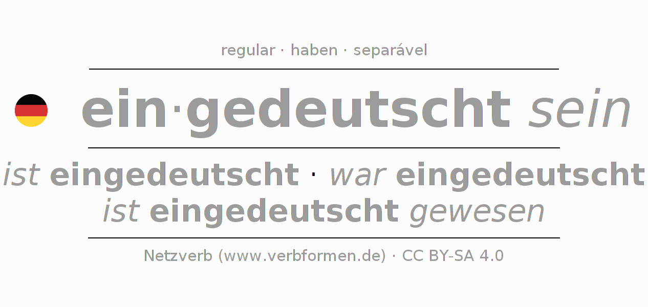A conjugação do verbo ein·gedeutscht sein é apresentada online assim como a Tabela de Verbo com todas as formas verbais no singular e no plural, e em todas as pessoas (1ª pessoa, 2ª pessoa, 3ª pessoa) A flexão do verbo ein·gedeutscht sein é portanto, uma ajuda para os trabalhos de casa, testes, exames, aulas de alemão, para o estudo do alemão como língua estrangeira, como segunda língua e também na formação de adultos. Especialmente no aprendizado do alemão é importante a conjugação correta do verbo com as respectivamente formas flexionadas corretamente (ist eingedeutscht - war eingedeutscht - ist eingedeutscht gewesen). Mais informações podem ser encontradas no Wiktionary eindeutschen e no Duden eindeutschen.