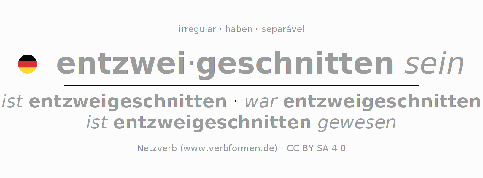 A conjugação do verbo entzweischneiden (cortar ao meio, cortar em dois) é irregular. As formas mais comuns são ist entzweigeschnitten, war entzweigeschnitten e ist entzweigeschnitten gewesen. A apofonia é feita com a vogal do radical ei