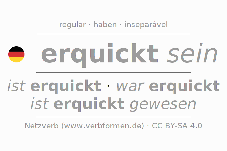 A conjugação do verbo erquickt sein é apresentada online assim como a Tabela de Verbo com todas as formas verbais no singular e no plural, e em todas as pessoas (1ª pessoa, 2ª pessoa, 3ª pessoa) A flexão do verbo erquickt sein é portanto, uma ajuda para os trabalhos de casa, testes, exames, aulas de alemão, para o estudo do alemão como língua estrangeira, como segunda língua e também na formação de adultos. Especialmente no aprendizado do alemão é importante a conjugação correta do verbo com as respectivamente formas flexionadas corretamente (ist erquickt - war erquickt - ist erquickt gewesen). Mais informações podem ser encontradas no Wiktionary erquicken e no Duden erquicken.