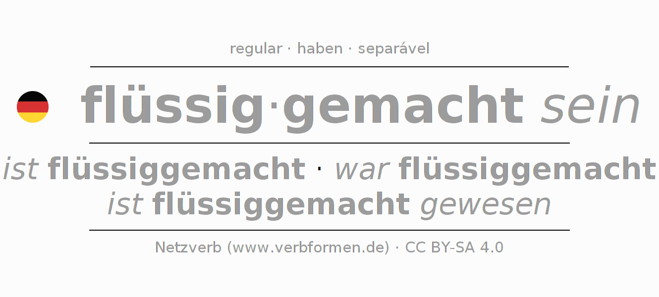 A conjugação do verbo flüssigmachen (converter em dinheiro, liquefazer) é regular. As formas mais comuns são ist flüssiggemacht, war flüssiggemacht e ist flüssiggemacht gewesen. O verbo auxilar para flüssigmachen é "haben".